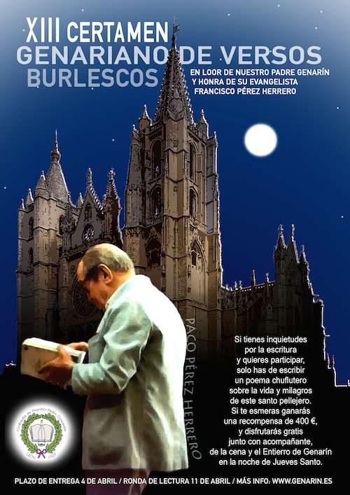 del treceavo certamen celebrado en 2025. La muy ilustre, lírica y etílica Cofradía de Nuestro Padre Genarín convoca el XIII Certamen Genariano de Versos Burlescos en loor de Genarín y homenaje a Francisco Pérez Herrero. Cerrándose el plazo el 4 de abril para participar a este certamen del nonagésimo sexto año de la era genariana, treinta y ocho poemas han sido aceptados a concurso procedentes de los cuatro puntos cardinales de la Península Ibérica y, allende los mares, de Argentina, Perú, Brasil o Cuba. También se hizo sentir la orujada divinidad en La Robla, La Bañeza, Trobajo del Cerecedo o La Chantría. El jurado compuesto por Maxi Barthe Arias, Fernando Pérez Álvarez, José Miguel de Lera Fernández y el ganador del último certamen celebrado José Nicodemo de la Guzpeña, ha concedido el honor de pregonar la palabra del Bendito Canalla en la noche de Jueves Santo al poeta Juan Fernández Polo, de León, por su obra “Ensoñación Genariana”. El de la beoda silueta también inspiró a Ignacio Laso, de Valladolid, cuyo poema "Romance y Rosario de San Genaro" ha sido reconocido con el accésit de la edición de este año y el privilegio de ser declamado en el crucero de la Plaza del Grano. Como se ha podido comprobar en la ronda poética de este Viernes de Dolores 11 de abril, en tiempos de inteligencias artificiales, el ingenio y la ironía de los fieles de Genarín prácticamente no tiene límites, guiados por el ejemplo del sin par Paco Pérez Herrero. Al amparo del eterno pellejero y del tendejón del Mercado del Conde Luna, la feligresía genariana ha honrado al mesías de Izagre con versos y brindis, como mandan los arcanos. ![]() Cartel anunciador del certamen |