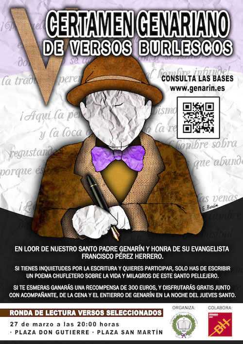 del quinto certamen celebrado en 2015. La Cofradía de Nuestro Padre Genarín convoca de nuevo su V Certamen Genariano de Versos Burlescos en loor de Genarín y homenaje a Francisco Pérez Herrero y a nuestro desaparecido Fermín Carnero. La participación en el mismo ha llegando a reunir un total de 20 poemas, creados principalmente en tierras leonesas y, por otro lado, procedentes de Valladolid, Gijón, Madrid, Jeréz de la Frontera y hasta incluso, y gracias a que en internet cualquier lugar del mundo está cerca, desde Polanco de México. El plazo de presentación de estas lindezas poéticas se cerró el día 20 de marzo, dándose públicamente lectura de los mismas el día 27 a las 20 horas, en primer lugar como en otros años, desde la Plaza Don Gutierre y finalizando en la Plaza de San Martín, en donde se hizo lectura del acta del jurado, dando a conocer al ganador. El jurado compuesto por Maxi Barthe Arias, Fernando C. Pérez Álvarez, Mario Díez Ordás y David López Mirantes, este último como ganador del certamen celebrado en el pasado año 2014, coincidieron en otorgar el premio a José Antonio Repeto González con su poema titulado "Pregón a Nuestro Padre Genarín, desvirgado y mártir", consiguiendo con ello la dotación económica de 300 euros otorgados por esta Cofradía, así como la invitación junto a un acompañante a la tradicional cena del Santo Entierro, en donde hizo lectura personalmente del mismo. ![]() Cartel anunciador del certamen |