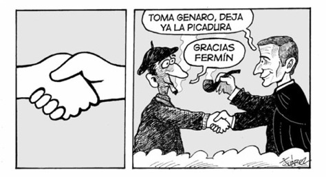 Por Mario Díez-Ordás Amigos todos: Hoy me toca la difícil tarea de entonar un gorigori genariano por un amigo, por el Vice-abad de mi Fervorosa, Herética y Respondona Cofradía, por uno de los hermanos impenitentes de esa astracanada de versos y orujo que León representa en la noche de Jueves Santo, cuando el Nazareno ha sido hecho preso en Santa Nonia y el pueblo abandonado por Dios se fabrica su becerro de oro con forma de pellejero en una perfecta danza de la muerte. La Muerte, la Canina, el implacable monigote huesudo que, como en un cuadro de Valdés Leal, danza por las calles leonesas en el Entierro de Genarín, decidió llevarse el año pasado a Fermín sin que ninguno de sus hermanos pudiésemos sospecharlo, porque fue discreto hasta para morirse. A uno, que hace tiempo que se le cayeron al suelo todas las ideologías, no se le puede pedir que glose la figura de Fermín como político ni como sindicalista, pues mis más de veinte años de amistad con él fueron poética y genarianamente platónicos, sin que jamás llegásemos a mayores sucumbiendo al pecado de la seriedad. En nuestras cenas de cualquier jueves del año no recuerdo haber hablado con él ni una sola vez sobre su vida pública ni sobre sus ideas, ni tampoco haber mantenido una sola conversación seria, pues tras su semblante aparentemente grave atesoraba un gran sentido del humor y de la ironía. A tanto llegó nuestra amistad que tuvo la ocurrencia allá por 2007 de encargarme la primera “oda al bacalao” que había de leerse en una gala que él mismo se había inventado destinada a promocionar este manjar de Valderas y la propia villa, en la que se entregarían unos premios en diversas modalidades llamados “bacalaos de oro”. Es decir, Fermín en estado puro, que allá donde estuviese no podía dejar de “hacer lío”, como diría el Papa. Compartimos Entierros de Genarín en años difíciles en los que apenas asistíamos veinte hermanos a la cena de Jueves Santo, tras haber acudido de mañana a la sede de UGT o de los grupos de teatro de Kike en una furgoneta del sindicato, conducida por el propio Fermín, a recoger los trastos de la Cofradía, que allí se custodiaban y que habíamos restaurado cuidadosamente en los días previos a la Semana Santa. Y así, con tanto romanticismo como trabajo, entre todos logramos salvar para la Ciudad una tradición única que corría serio peligro de desaparición y que, si León estuviese en Cataluña, hace años que gozaría de la declaración de interés turístico internacional. Por eso, cuando el hermano Jesús Berjón, licenciado en Bellas Artes, modeló la imagen de Genarín, a nadie nos extrañó que tuviese un curioso parecido con el Vice-abad, como si el Santo pellejero hubiera querido agradecerle así tantos años de fidelidad. Dejadme, dejadme que en esta mañana de nostalgias le cuente a Fermín cuánto le echamos de menos en su Cofradía: Se nos fue el corazón tras de tu muerte dejándonos más huérfanos de sueños de utopía, coraje y tus empeños para traer justicia en vez de suerte. Se nos fue tu ironía cristalina, tu saber lo que nadie te enseñara, tu ilusión por el hombre, tu preclara visión que sólo da la indisciplina. Se nos fueron aquellos Jueves Santos que mi mente revive si te pienso y el humo de tu pipa es el incienso que hace bruma el recuerdo de tu encanto. Se nos fueron tu capa y tu sombrero contando treinta pasos en la Sal aserrín aserrán como un chaval corriendo tras el gran Pérez Herrero. Se nos fue tu valor en la muralla trepando por los cantos legendarios que fueron el postrer confesionario del rey de la gallofa y la canalla. Se nos fue tu romance en “El Infierno” o en la Plaza del Grano con la luna dormitando en la fuente como cuna mientras amanecía el día eterno. Se nos fue quien hacía cofradía, quien siempre fue uno más de sus hermanos, quien se ofreció al trabajo con sus manos y nunca utilizó su nombradía. Se nos fue el Vice-abad que predicara la libertad del Santo pellejero a reyes, senadores y mineros; por eso Genarín tiene tu cara. Se nos fue tu osadía y la llevaste donde ya no hace falta tener fe y al bueno de San Pedro un comité y una ugeté en el cielo le montaste. Hermano, yo te canto por si acaso no nos acostumbramos a añorarte y a alguien se le ocurre hacerte un paso. A la Sal volverá nuestro estandarte y siempre quedarán los treinta escasos porque iremos, Fermín, a recordarte. ADIVINANZAS EN HOMENAJE Por Fernando C. Pérez Álvarez Una capa, una pipa y un sombrero son signos…. De un caballero ¿Cómo rendir homenaje a un compañero tan cuerdo? Con recuerdo ¿Qué puede hacerle escapar del olvido de la historia? La memoria Todos le respetaron por luchador y guerrero… A Carnero ¿A quien definió, por fin, ser devoto a Genarín? A Fermín ¿Con qué brindar por un hombre limpio, libre y sin tapujo? Con orujo ¿Qué desean los cofrades para su buen viceabad? La paz ![]() FERMÍN Fernando C. Pérez Álvarez En el cielo genariano ya brilla una nueva estrella, ha llegado ya otro hermano, al fondo de su botella. Vivirás en nuestra risa, en el chocar de los vasos, en Jueves Santos de brisa, en calles de treinta pasos. En meriendas de cofrades, en bodegas y festines, en leyendas de los bares, en noches de genarines. En versos de socarrones, en milagros con misterio, en gentes sin ser capaces de tomar la vida en serio. En cuentos poco ejemplares, en murallas escaladas, en pícaros y en juglares, en las plazas empedradas. En el humo de una pipa, en el placer de beber, en la pena que disipa el amor de una mujer. Por conocerte, brindamos, que bien mereció la pena. Por recordarte, bebamos ¡Una copina bien llena! Una va por Genarín y va otra más por Fermín. ![]() |